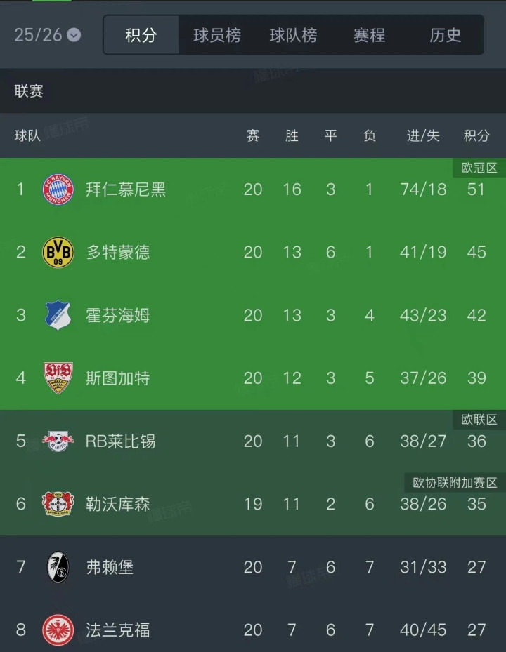 在多特不断连胜的同时,德甲又出现了一支异军突起的球队霍芬海姆。在这赛季球队阵容整合完之后,他们逐渐在德甲赛场上拿出了越来越多出色的表现。目前从12月初不敌多特之后,目前他们已经实现了7场不败,其中6胜1平。这样出色的表现也让他们目前以42分高居第三,超过了勒沃库森,RB莱比锡等一众德甲强队。目前落后拜仁9分。这样稳定的发挥也使得他们也成为了德甲冠军的争夺者之一。